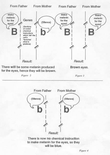 Let's call the gene which gives the instructions to make melanin in your iris B. This gene says to your cells, in effect, "Make melanin for the iris." There is another gene (let's call it b) which occupies the same place in the blueprint, and which says nothing about manufacturing melanin, So if you Inherit the B from your father, and b from your mother, they will line up together, as shown in Figure 2.