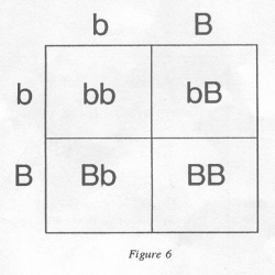 Number 4 is the most interesting. Can you see how a child can be born with blue eyes although both parents have brown eyes? This is because both parents carried the hidden factor for blue eyes, Continuing with Number 4, we can work out what proportion of their offspring on average, should have blue eyes. We do this by means of a simple concept called a punnet square. (Just persevere a little; it becomes relevant to skin color in a moment!) (See Figure 6.)